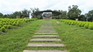 🔸陸橋を渡り、育成中のコキア(ほうき草)の緑色の坊主頭が整然と並ぶ「カリヨン丘」の丘から中央エリアへ。