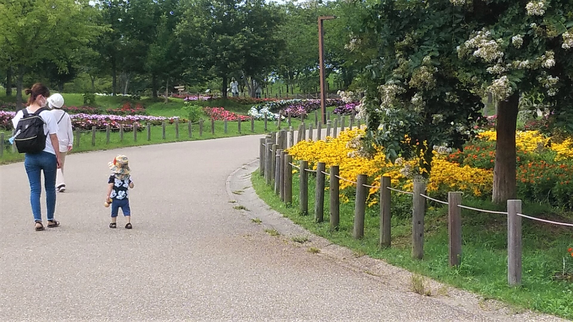 バイバイと愛嬌を振りまいてくれた、よちよち歩きの元気ベビーちゃんも、お花の散歩を楽しんでいる様子。右に左に、ルドベキアとインパチェンスのお花畑をのんびりと、、、、。