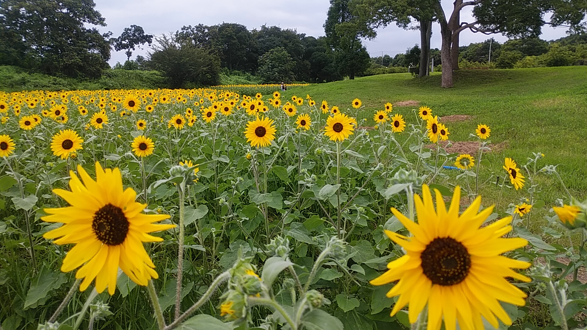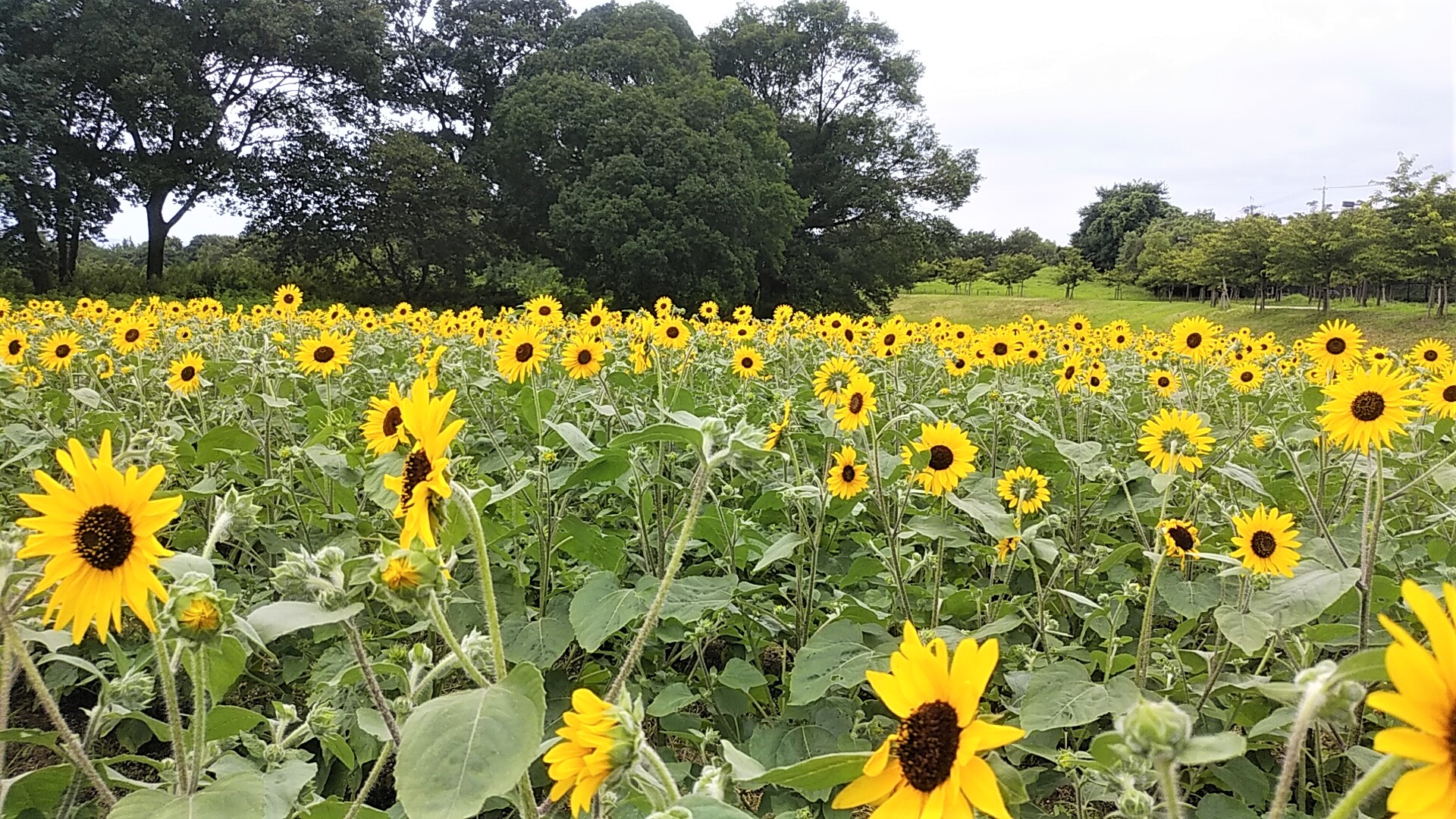 公園館向かいの「芝生の丘」にもたくさんヒマワリが育っているが下から見る限りではまだ開花前のようで、本格的な梅雨明けの夏には咲き誇ることだろう。